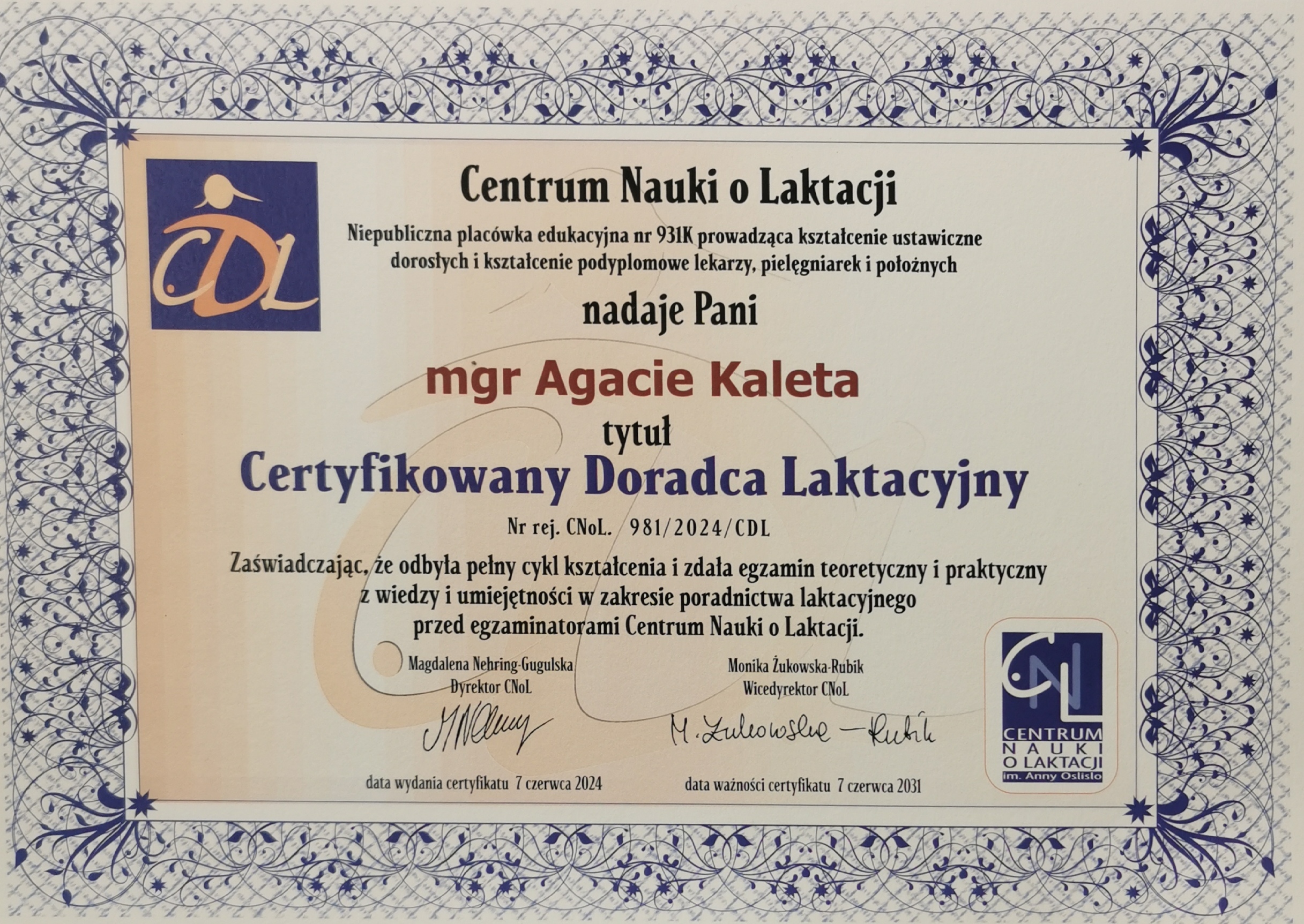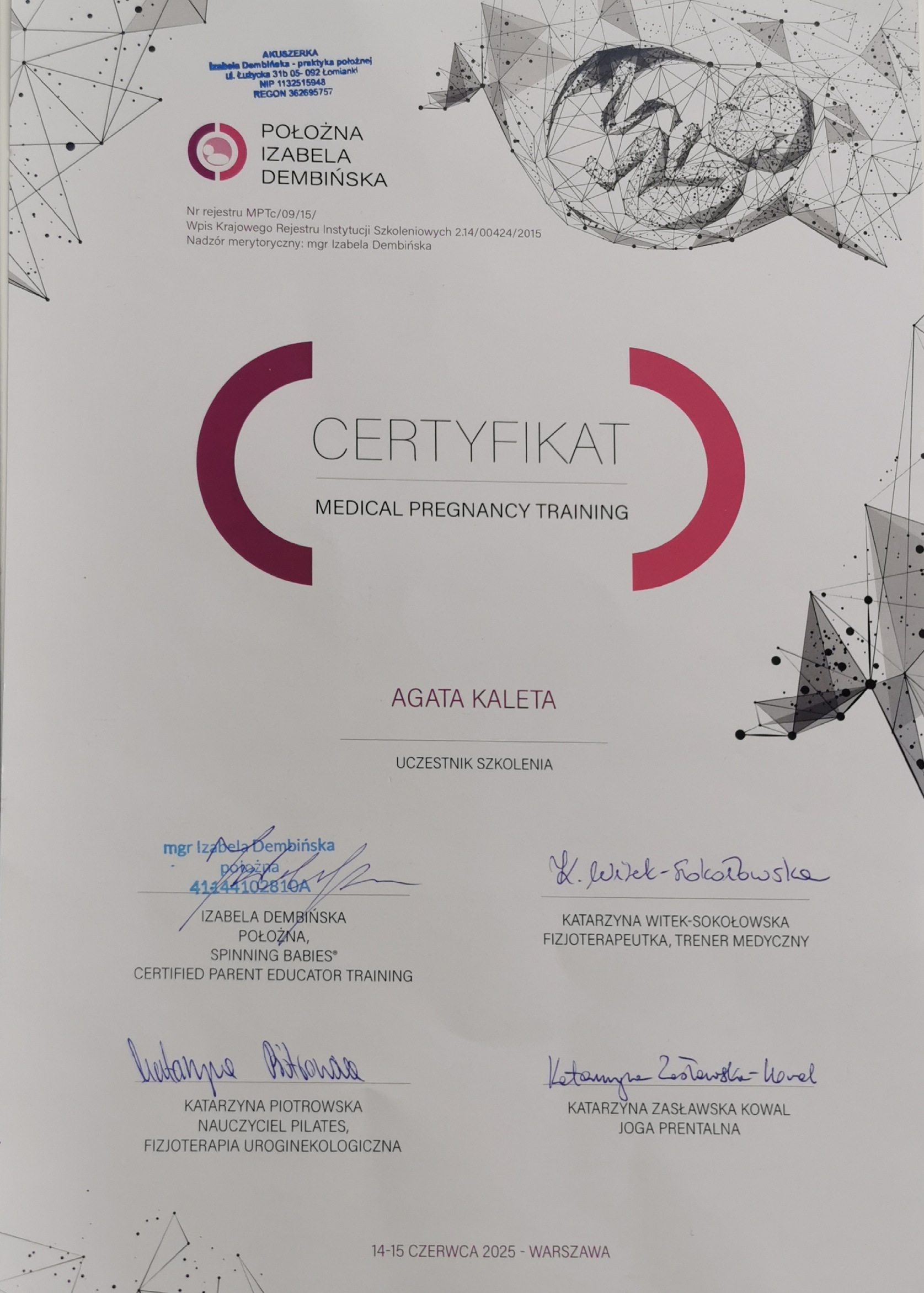 Jestem położną, certyfikowanym doradcą laktacyjnym oraz doradcą noszenia w chustach i nosidłach miękkich. Studia magisterskie ukończyłam na Uniwersytecie Medycznym im. Karola Marcinkowskiego w Poznaniu w 2015r. Swoje doświadczenie zawodowe zdobywałam na oddziale porodowym w Ginekologiczno-Położniczym Szpitalu Klinicznym przy ulicy Polnej w Poznaniu, gdzie pracowałam na stanowisku położnej ds. opieki nad noworodkiem.
